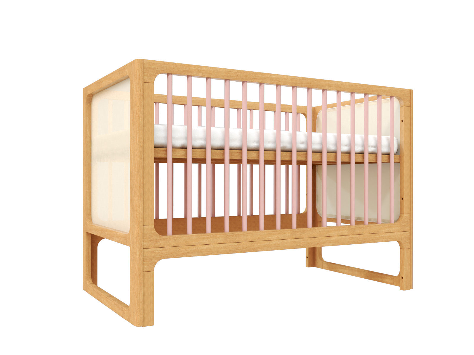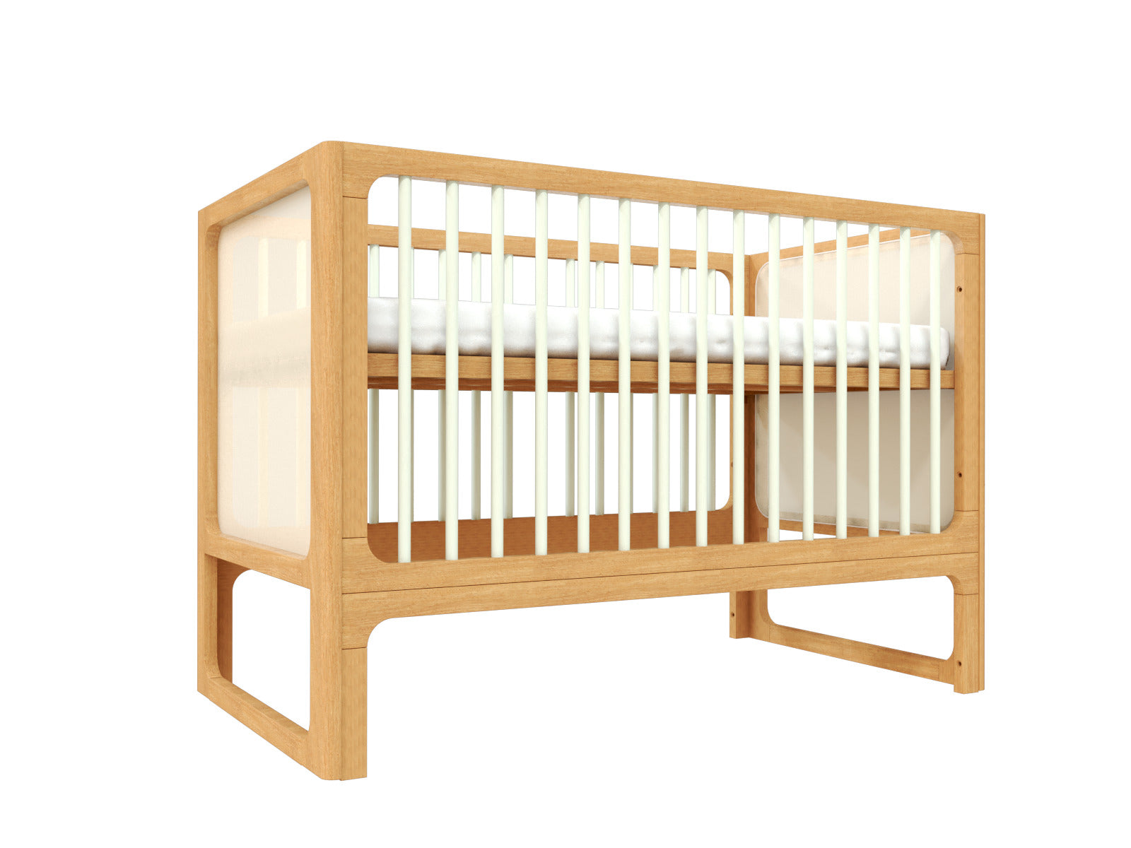 Com estrutura em madeira maciça e gradeados finos, disponíveis em 3 cores, o berço Skandi é uma peça que acolhe com delicadeza. A cabeceira e peseira em tela tensionada trazem leveza visual e permitem que a luz percorra o móvel de maneira suave, criando um efeito de transparência sutil.