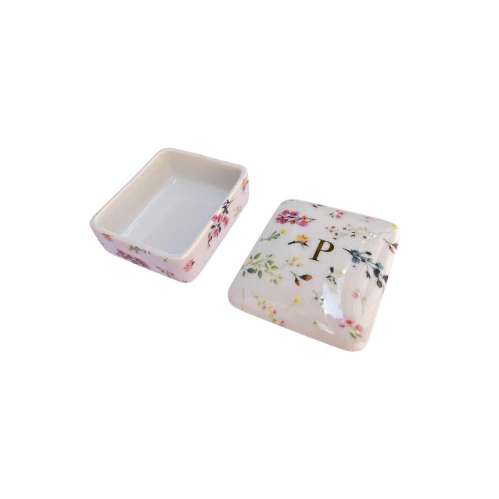 Caixinha de porcelana com estampas de todas as letras em filete ouro para usar como porta joias, ou para decorar.